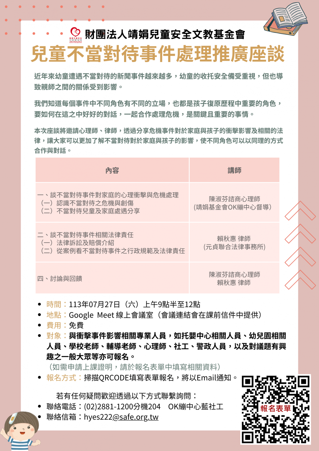 (四) 對象:幼兒園相關人員、學校老師、輔導老師、心理師、社工以及對議題有興趣之一般大眾等皆可報名。