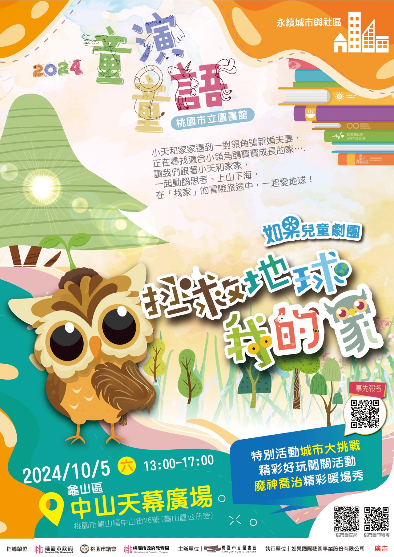 二、 | 第5場演出訂於113年10月5日(六)下午1時至5時,於龜山區中山天幕廣場演出永續城市與社區兒童劇場《拯救地球我的家》。 |