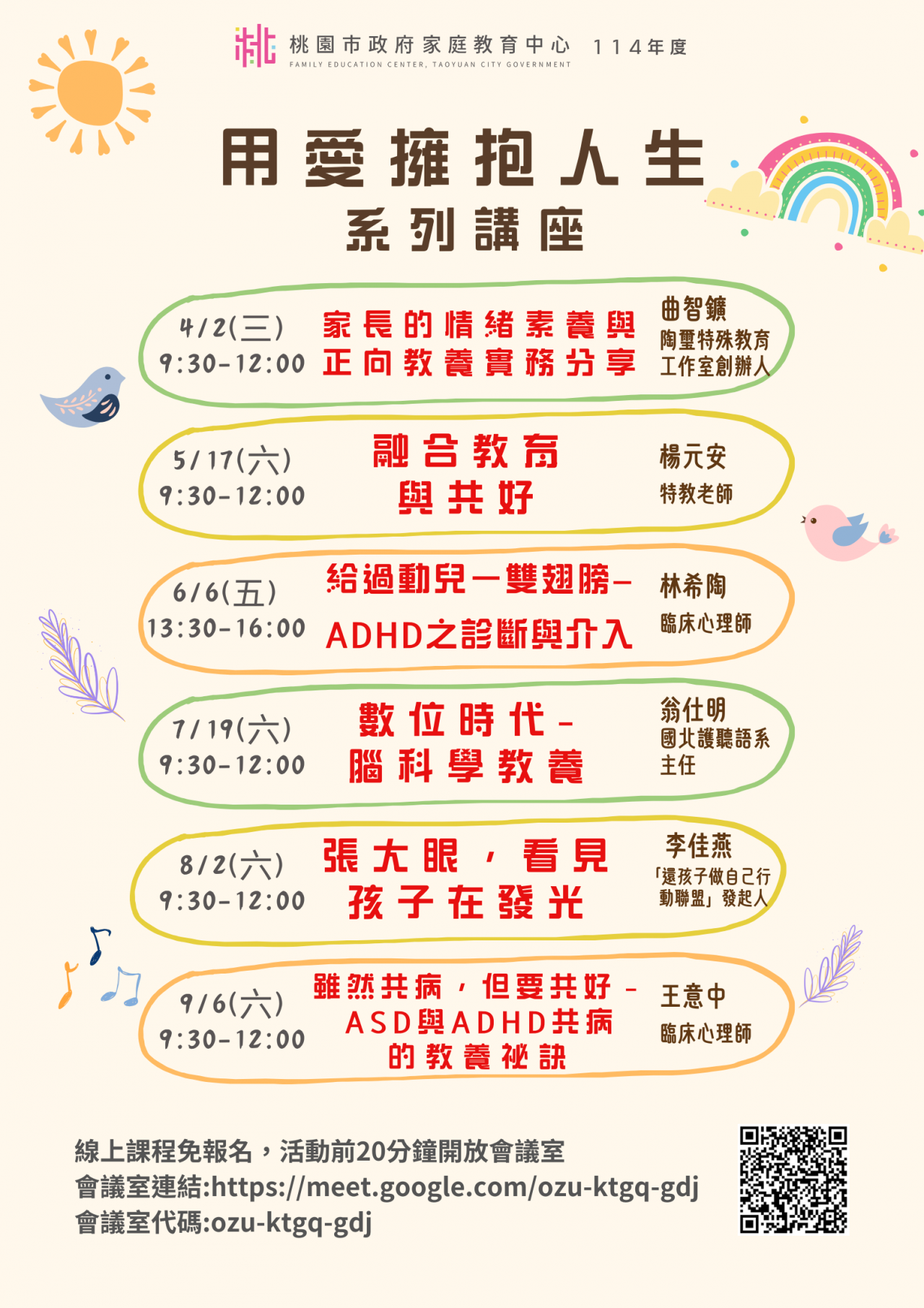 二、 | 旨揭課程詳細資訊,請見中心課程行事曆(https://reurl.cc/xlGyGL)或追蹤「桃園市政府家庭教育中心」FB粉絲專頁;另倘有家庭教育個別化服務需求,可撥打4128185家庭教育諮詢專線,本市市民可申請小桃家線上諮詢室(預約連結:https://reurl.cc/oZWOY5),由中心媒合專業人員透過線上會議室提供服務。 |
