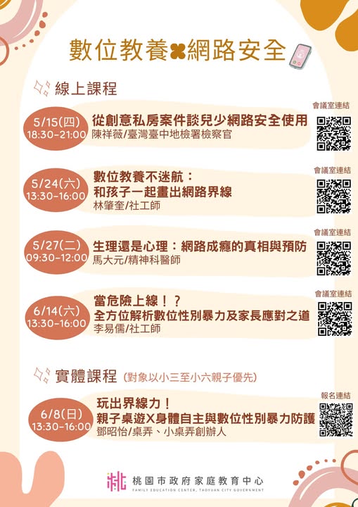 三、 | 旨揭課程詳細資訊,請見中心課程行事曆(https://reurl.cc/xlGyGL)或追蹤「桃園市政府家庭教育中心」FB粉絲專頁;另倘有家庭教育個別化服務需求,可撥打4128185家庭教育諮詢專線,本市市民可申請小桃家線上諮詢室(預約連結:https://reurl.cc/oZWOY5),由中心媒合專業人員透過線上會議室提供服務。 |