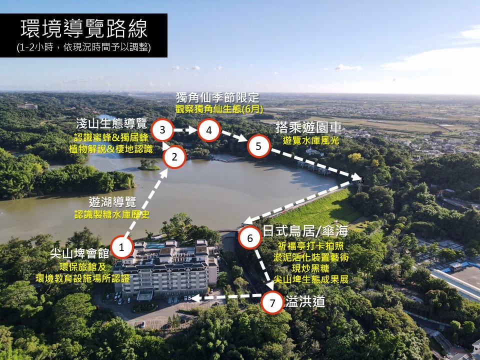 二、 | 柳營尖山埤渡假村位於臺南市柳營區,距國道三號柳營交流道出口約5分鐘車程。園區已取得環境教育設施場所認證,並同時具備環保旅館與綠色餐廳,提供住宿、餐飲、會議、休閒及環境教育學習等多元服務。110年榮獲環境教育設施場所評鑑「優異單位」。 |