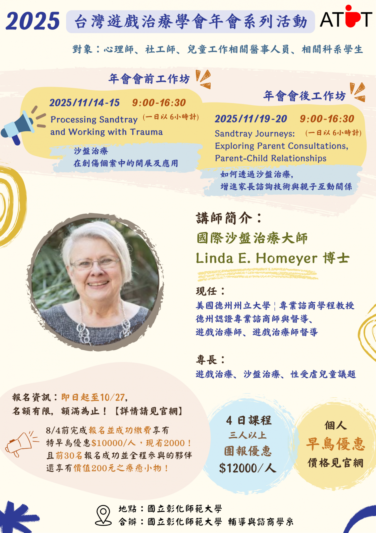 主旨: | 本會將於114年11月14、15日;11月19、20日舉辦【台灣遊戲治療學會年會系列活動】沙盤治療在創傷個案中的開展及應用;如何透過沙盤治療增進家長諮詢技術與親子互動關係,詳情如說明及附件,敬請貴單位協助張貼宣傳與鼓勵貴單位相關人員參加。 |