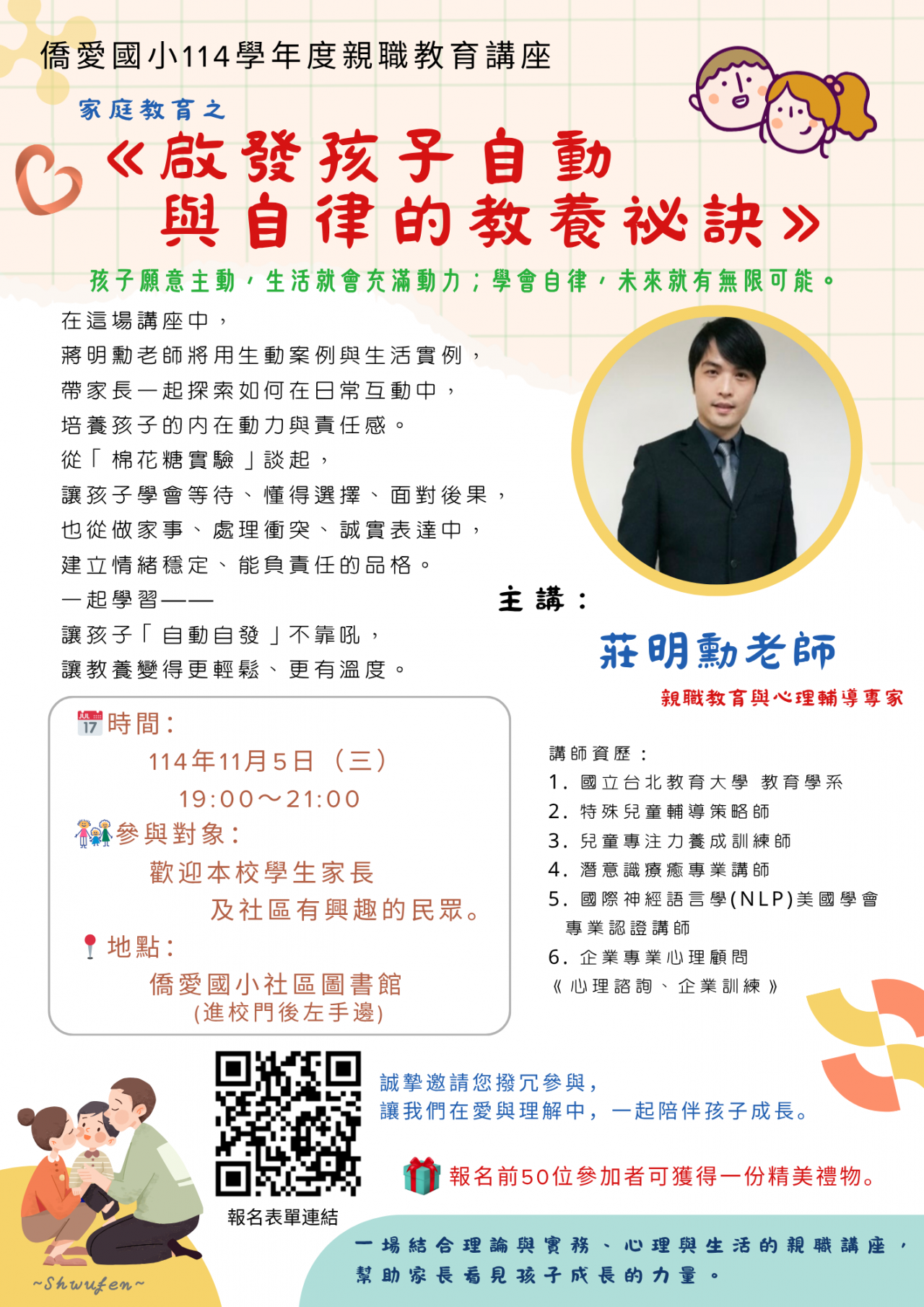 | 主旨: | 本校辦理「114學年度教育優先區親職教育講座」,敬請協助公告並鼓勵貴校教師、家長及社區人士踴躍參加,請查照。 |