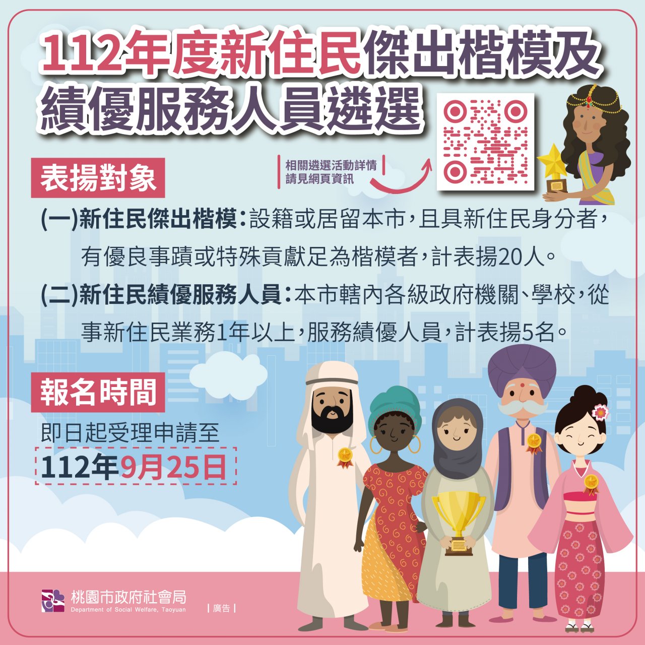主旨: | 轉知本府社會局辦理桃園市新住民傑出楷模及績優服務人員遴選計畫,請協助宣傳轉知,請查照。 |