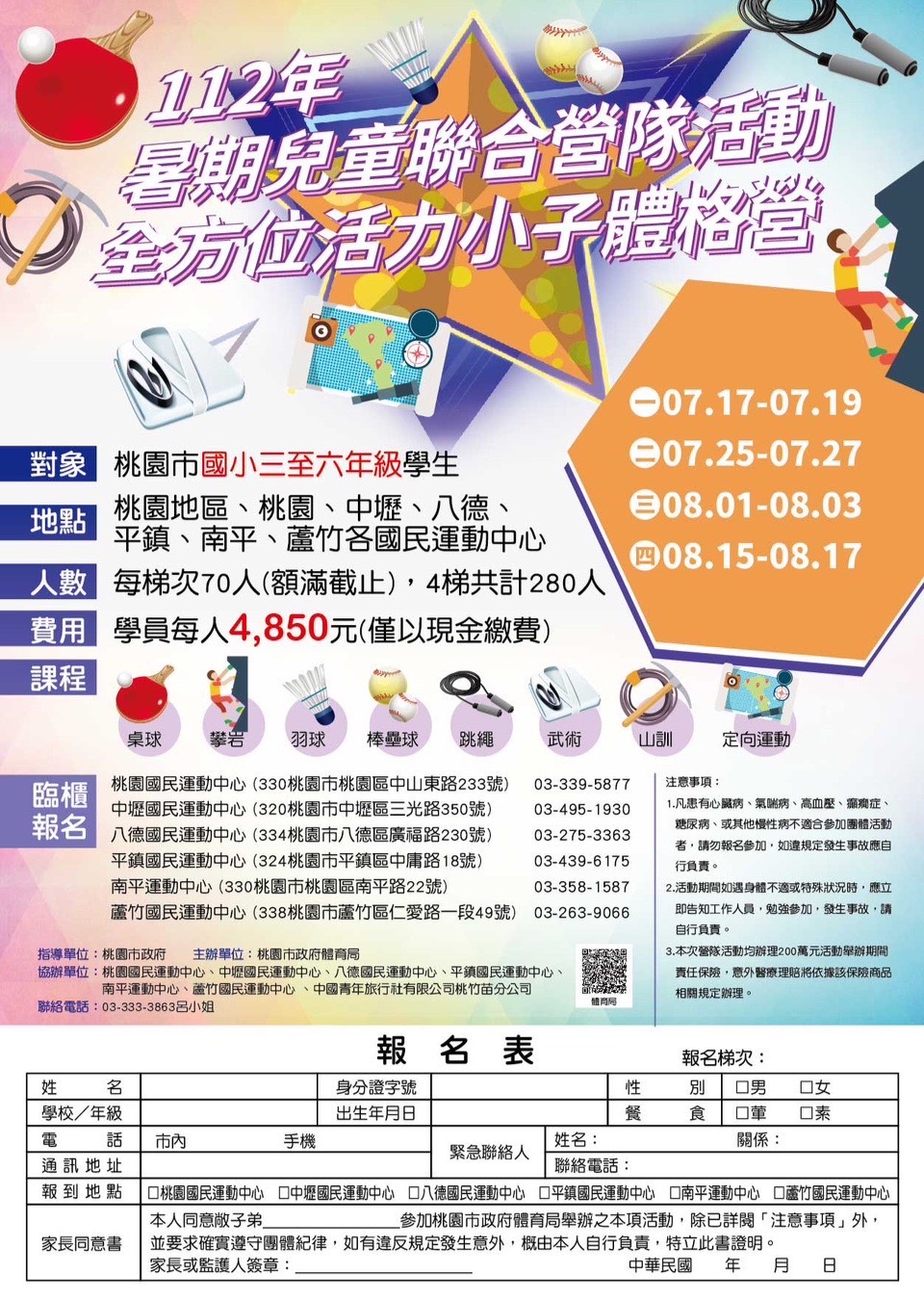 二、 | 為更加豐富兒童暑期生活,桃園市政府體育局委託中國青年旅行社桃竹苗分公司結合運動中心資源,辦理兒童聯合營隊活動,活動資訊如下: |