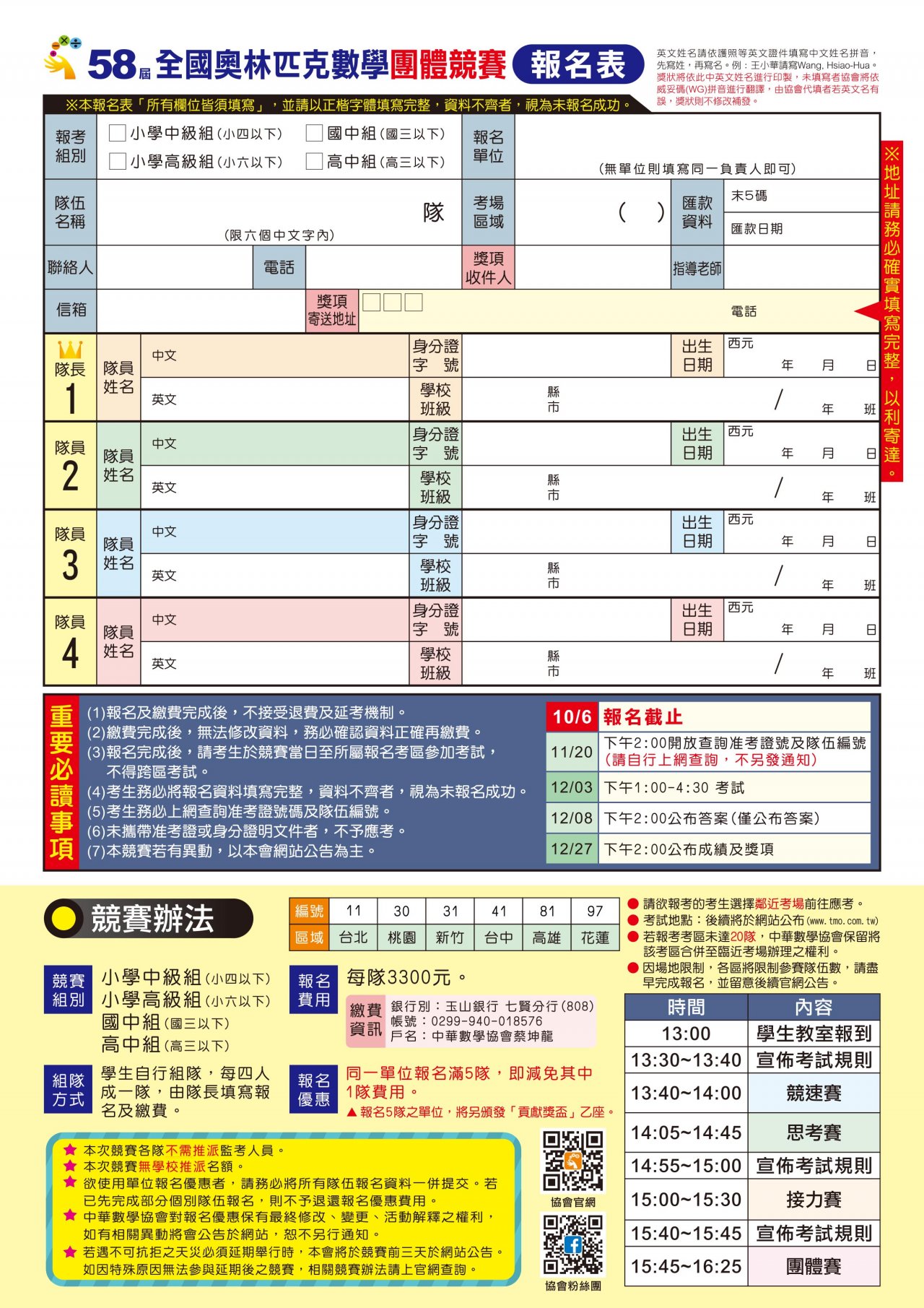 二、 檢附「第58屆全國奧林匹克數學團體競賽」競賽活動相關文宣,供 貴校參閱。