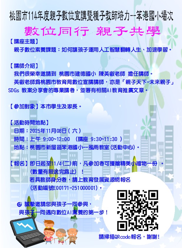 | 主旨: | 有關桃園市114年度「推動中小學數位學習精進方案」親子宣講暨種子教師培力計畫-笨港國小場次,請貴校協助公告活動訊息及鼓勵家長踴躍參加,請查照。 |